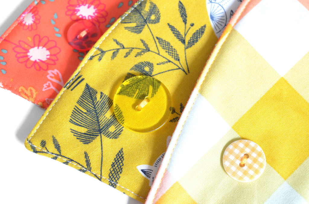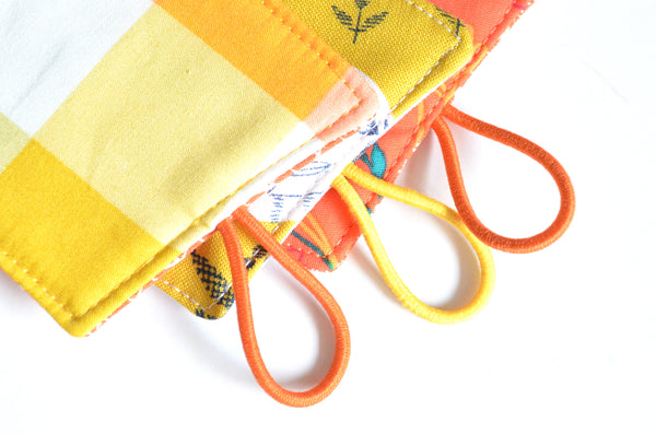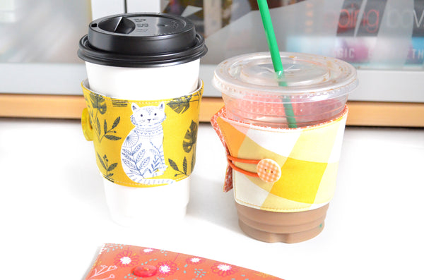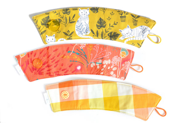 โ These orange and yellow coffee sleeves are made with a beautiful floral, plaid, and catย fabric, paired with matching buttons! Please note, exact fabric placement or button style may vary from some of the photos shown.