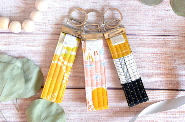 โ ย These key fobs feature a beautiful mix of cotton fabrics in a variety of prints and colours, quilted with beautiful straight-lines in a coordinating thread