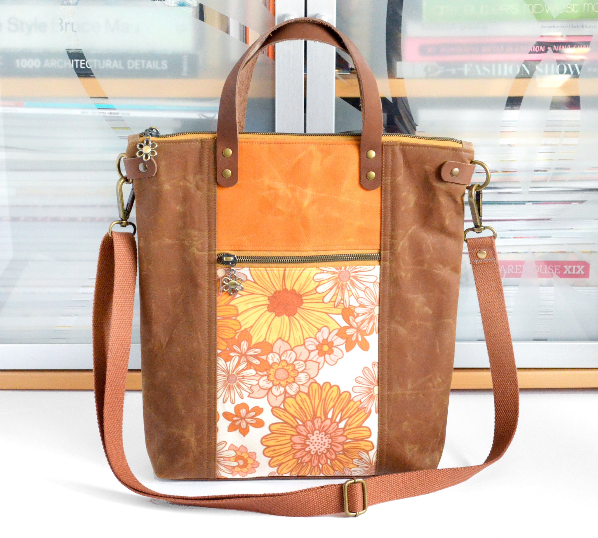 โ˜… This tote bag features a saddle brown & ochreย waxed-canvasย exterior, with a beautiful floral canvas feature panel!ย This bag includes a coordinating adjustable crossbody strap.