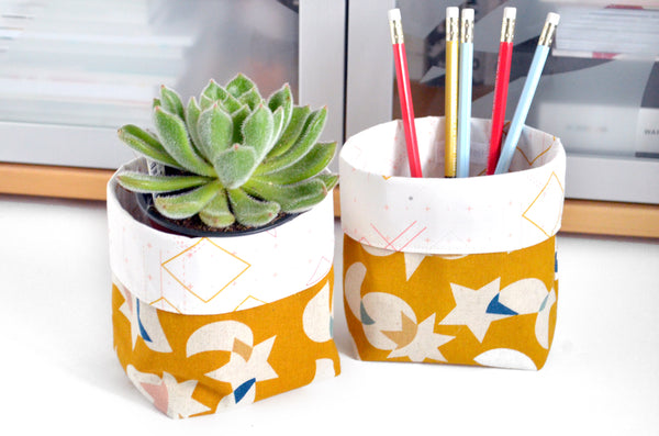These fun fabric plant pots are made from a variety of beautiful cotton-canvas prints, with bright coordinating lining fabrics which peek out the top! These fabric covers are the perfect solution to the ugly plastic pot your plant comes home in from the store, with no more need for messy re-potting. Just slip your existing plant pot into this bin, and voila! Theyโre even height-adjustable to perfectly suit different sizes of plants, or when adapting these bins for other specific needs. These little buckets also make the perfect container for holding pens and pencils on your desk, cosmetic brushes in the bathroom, essential oils on your nightstand, or any other odds and ends you need to keep organized. Their versatile uses make these a great gift for gardeners, co-workers, teachers, or yourself!