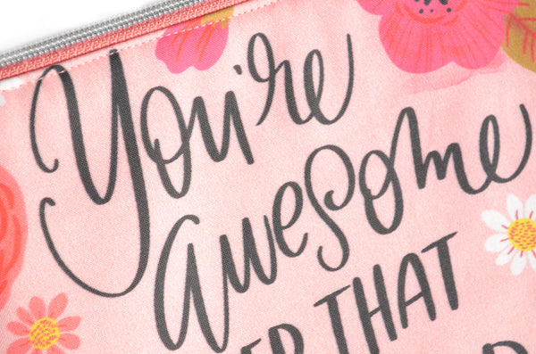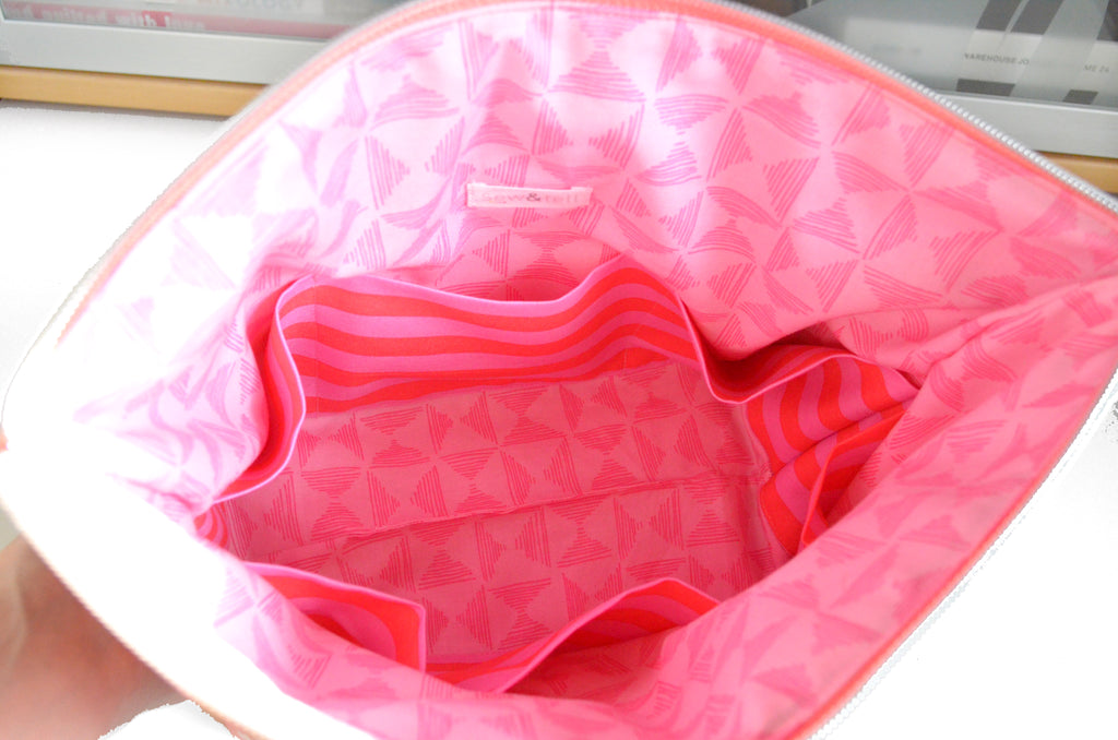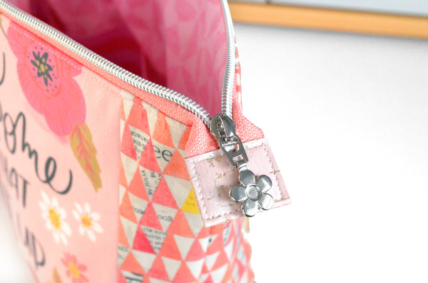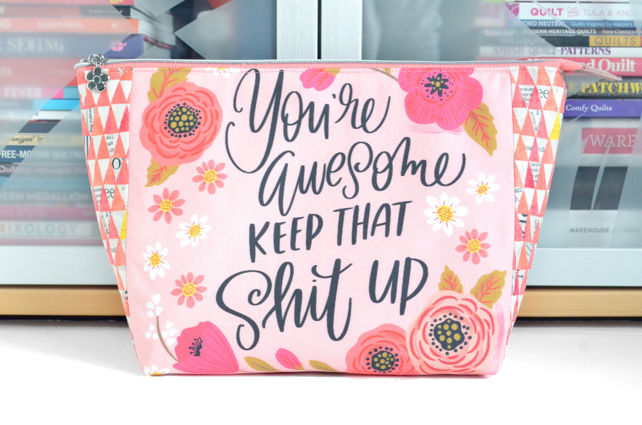 โ This pink jumbo toiletryย bag is made with a fun "sweary" printย fabric, designed by Cynthia Frenette!